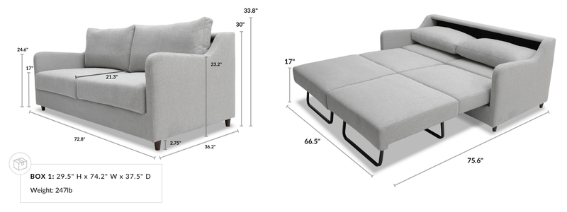 Noble has a larger box, and the box dimensions are 29.5" H X 74.2" W X 37.5" D. The minimum clearance is 29.5" in the box and 28.5” out of the box. Ensure that any pathway leading to the room meets this minimum. Firstly, measure your door width and height, including the diagonal measurement between door jambs. Account for door handle and swing direction. Also, measure the width, height, and depth of pathways leading to the room. Check for potential obstructions. Please reach out to us if you are not sure or need another sofa bed advice for tight space. Email: contact@spaze.com